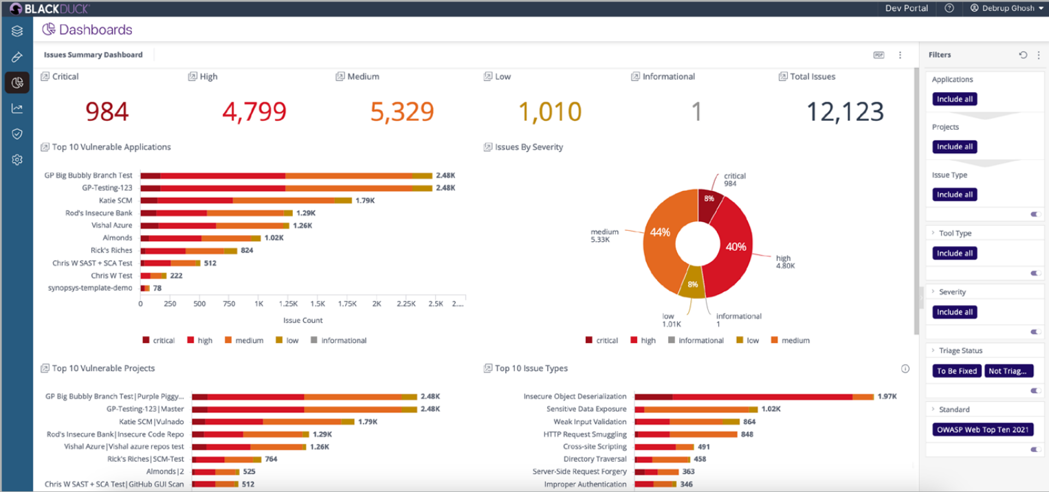 - Unificação de Ferramentas: O SRM integra-se com mais de 135 ferramentas, Black Duck ou não, incluindo SAST, DAST, SCA, IAST, segurança de rede, análise de containers, ferramentas de desenvolvimento, entre outras. Isso cria uma fonte única de registro de segurança de aplicações (AppSec), permitindo que as equipes rastreiem a eficácia da segurança por meio de painéis de controle com KPIs e análises de produtividade.