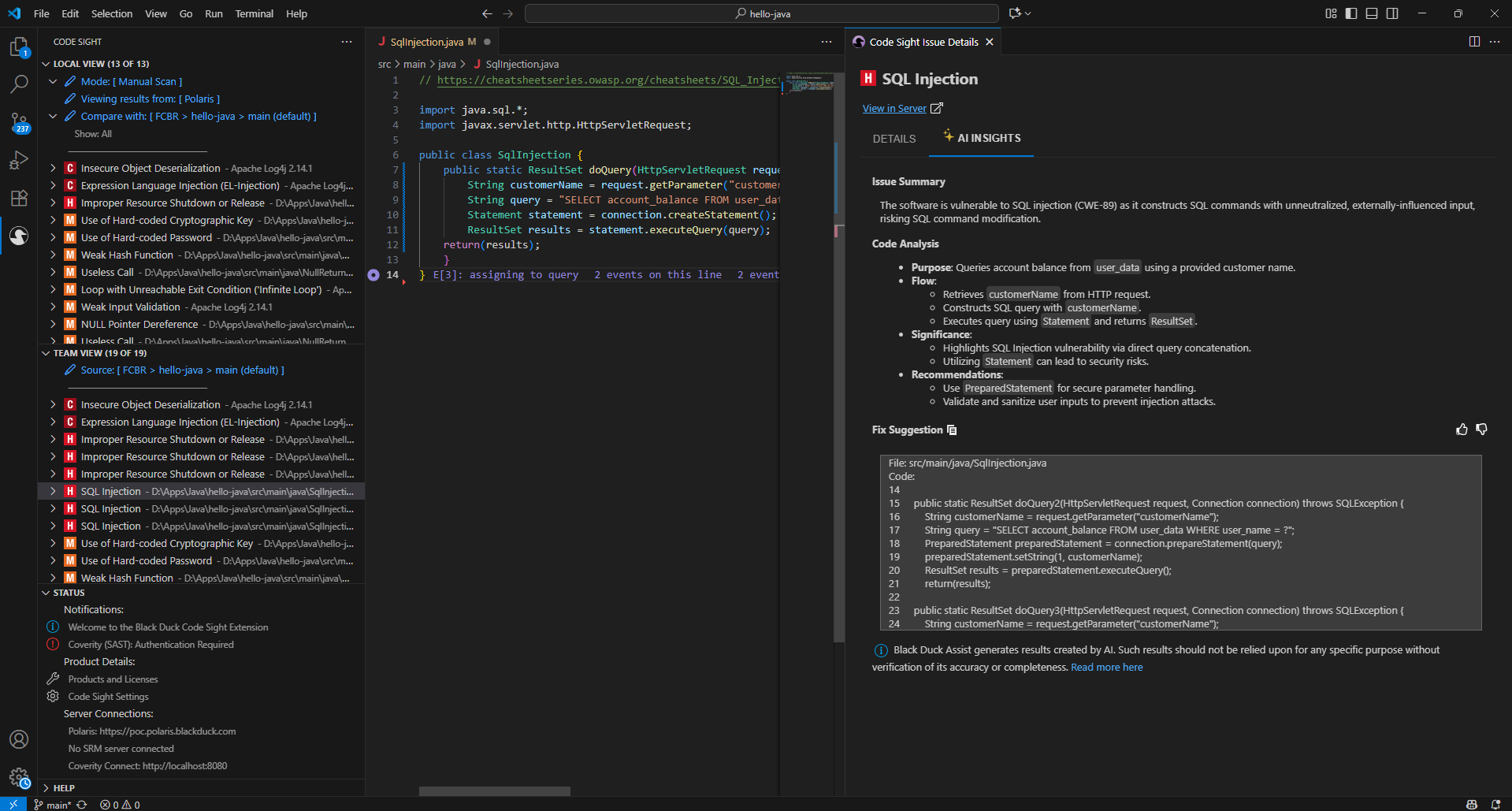 Code Sight: O Code Sight é um plugin altamente eficaz para IDEs que fornece análise de segurança de código em tempo real e integração com as ferramentas de SAST e SCA da Black Duck, permitindo que desenvolvedores identifiquem e corrijam vulnerabilidades de segurança durante o processo de codificação e verifiquem o que foi encontrado nas análises centrais. Veja abaixo os principais pontos em relação ao Code Sight.