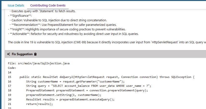 - Informações acionáveis: A ferramenta fornece informações detalhadas sobre as vulnerabilidades e problemas encontrados no código-fonte, incluindo detalhes técnicos, sugestões de correção geradas por IA, contexto e trechos de código que contribuíram para que a vulnerabilidade acontecesse, facilitando a análise e remediação do problema.